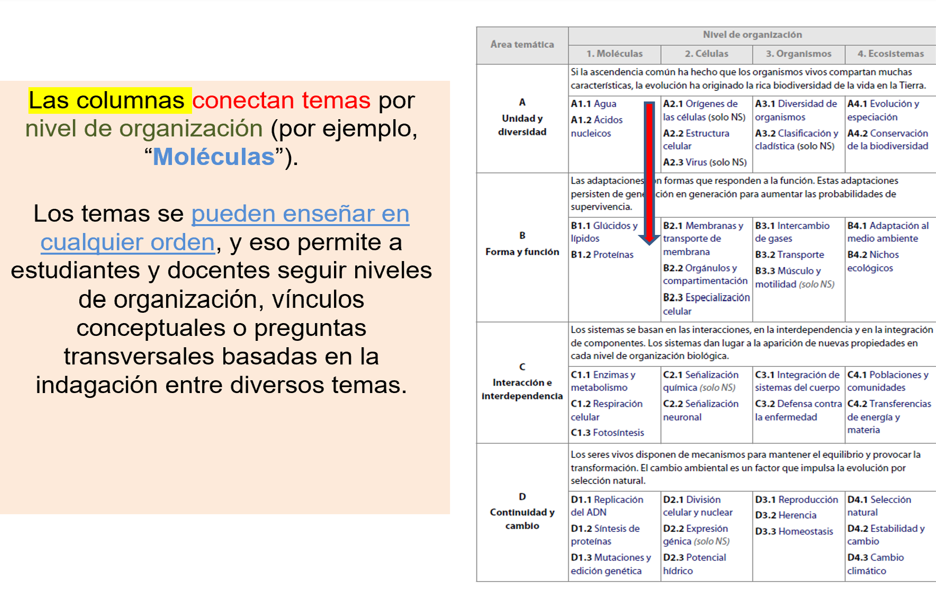 C-Interacción e interdependencia: Los sistemas se basan en las interacciones, en la interdependencia y en la integración de componentes. Los sistemas dan lugar a la aparición de nuevas propiedades en cada nivel de organización biológica.