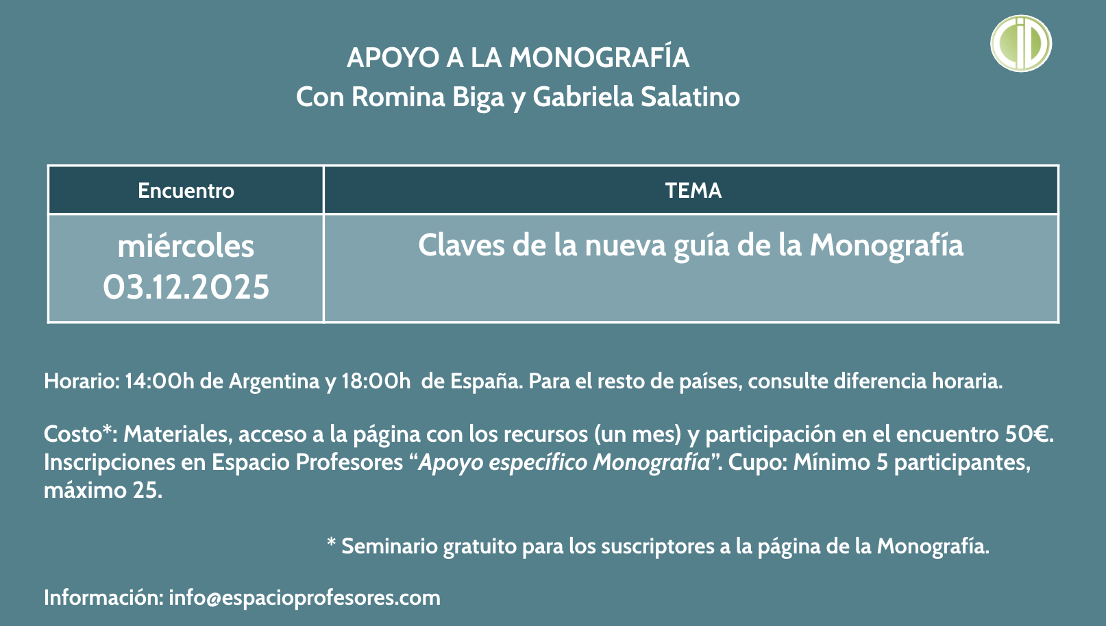Este nuevo encuentro con nuestras autoras Gabriela Salatino y Romina Biga versará sobre los aspectos más importantes que hay que tener en cuenta en la orientación y supervisión de los alumnos en la nueva guía de la Monografía (primera evaluación 2027).